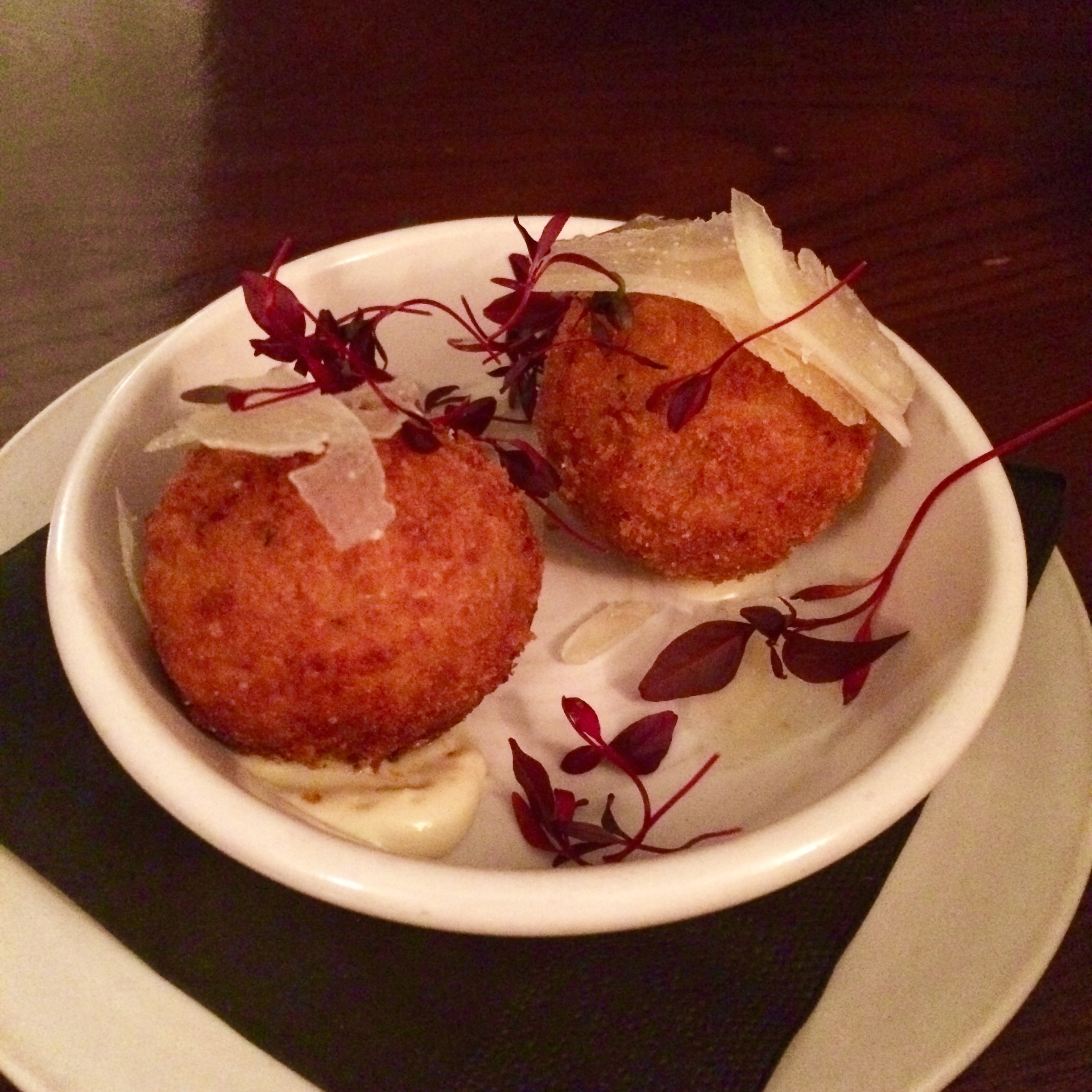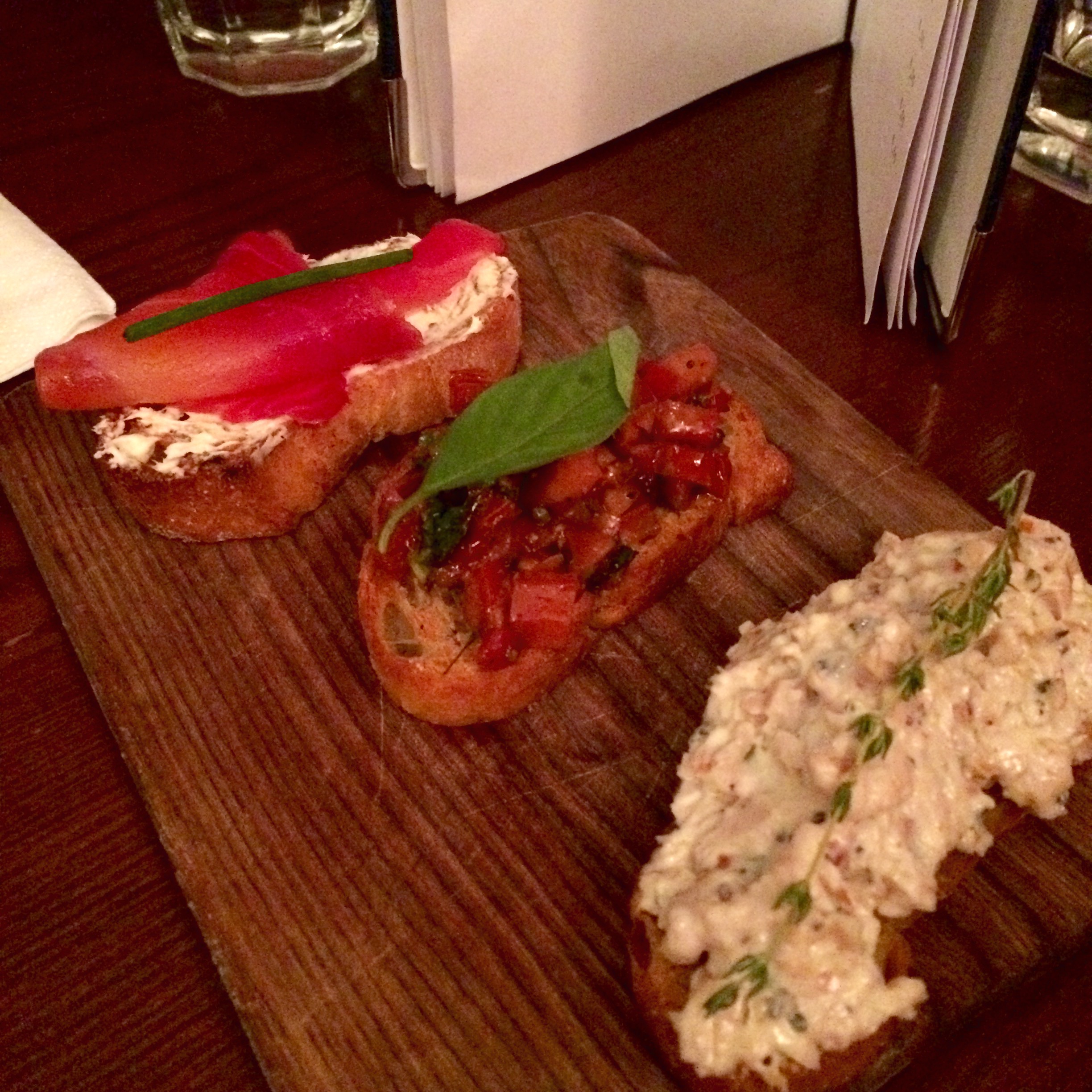 1: Sharing starters; the crostini selection, croquettes and risotto.