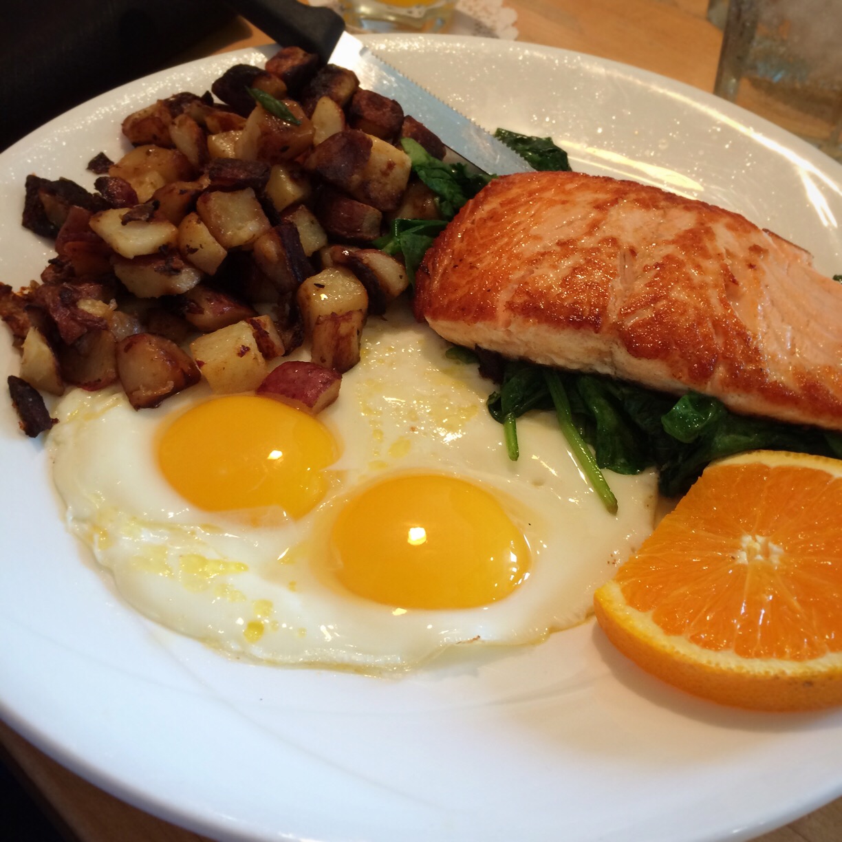2) Grilled Salmon & Eggs (US$ 17.99): Exactly what it says on the menu, a piece of salmon and some eggs, served with diced red potatoes and a bed of spinach. Spinach was still green but needed to be drained of the juice; the juice made the potatoes slightly soft. The salmon was well-cooked, but a very big portion for breakfast.