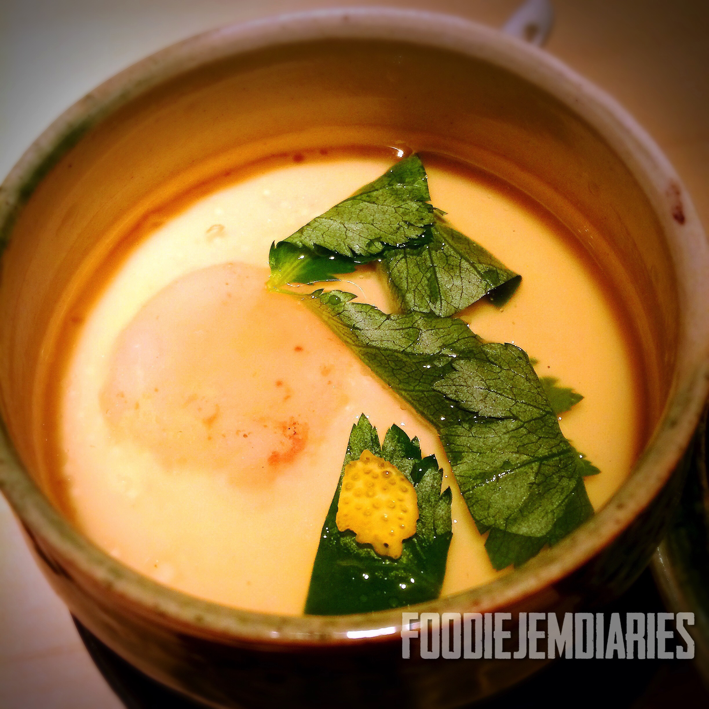 O-toro skewers were again divine, paired with wasabi and onion to cut the oiliness of the tuna. There is also a slight drizzle of lemon that enhanced that mouth-melting tuna. The Chawanmushi or steamed custard had a hint of yuzu and a clear bonito broth on top. It was a light and smooth custard, with shrimp and ginko nut hidden inside. The shiso also added unique flavour.