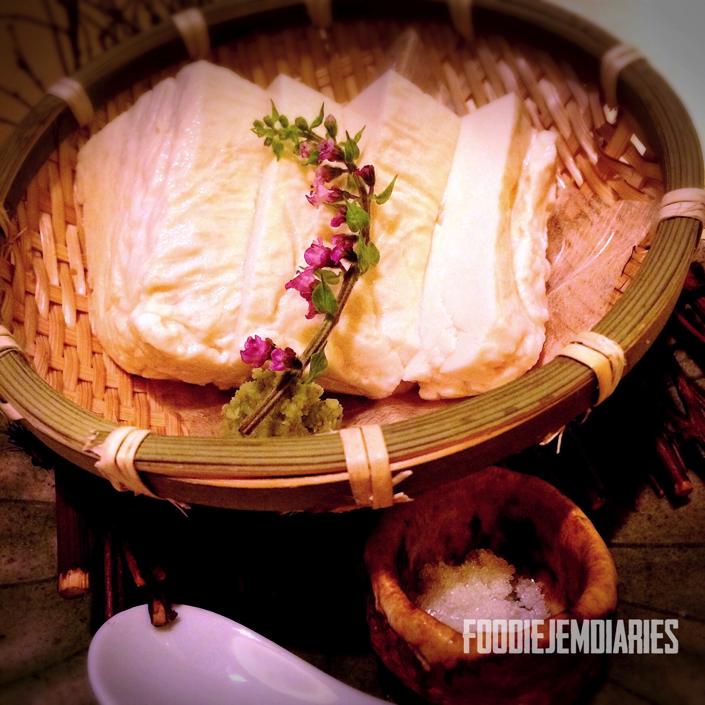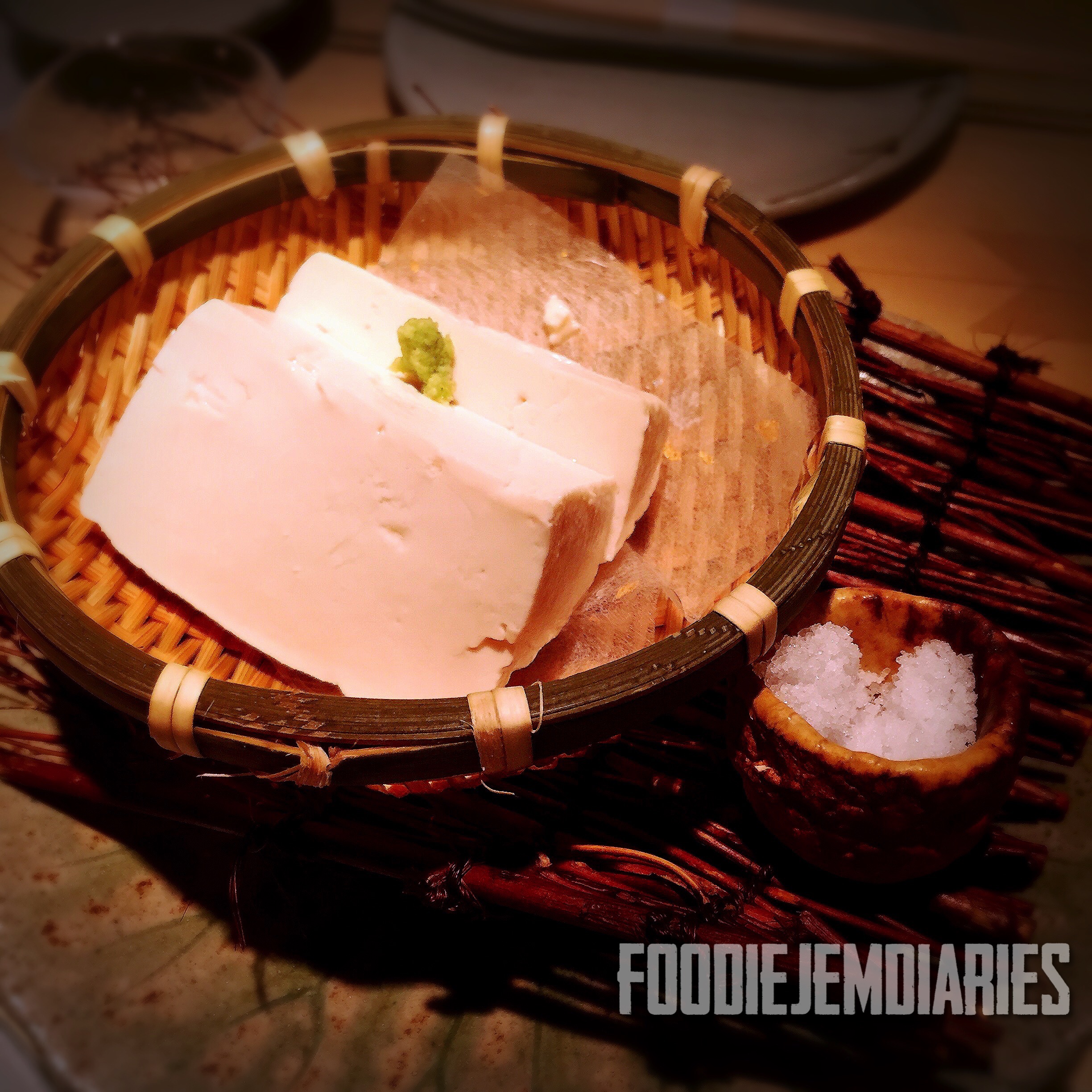 Fresh Handmade Kyoto-style tofu and Tempura Uni/sea urchin parcels with seaweed