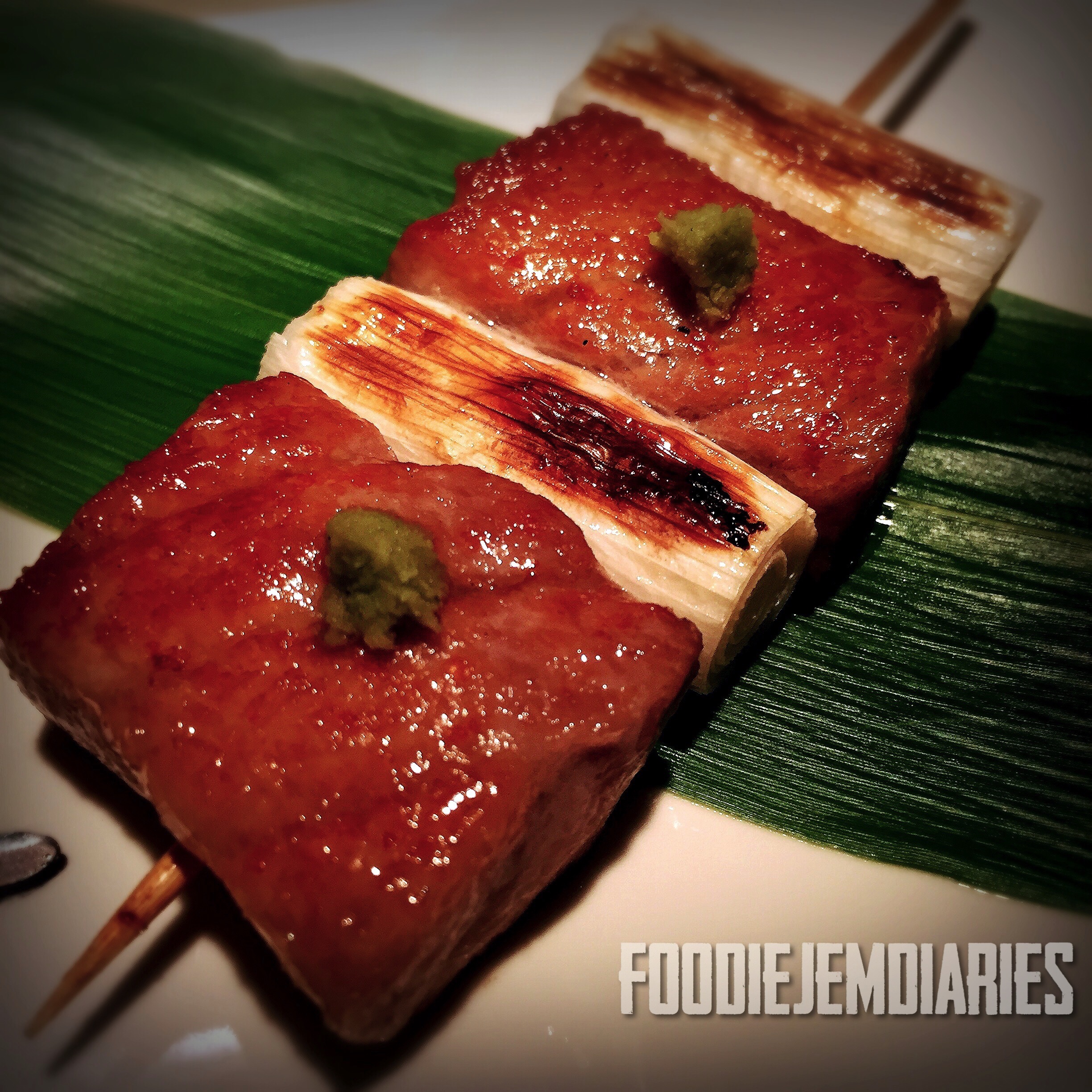 Fatty Tuna (O-toro) & Spring onion skewer and Chawanmushi: steamed japanese egg custard
