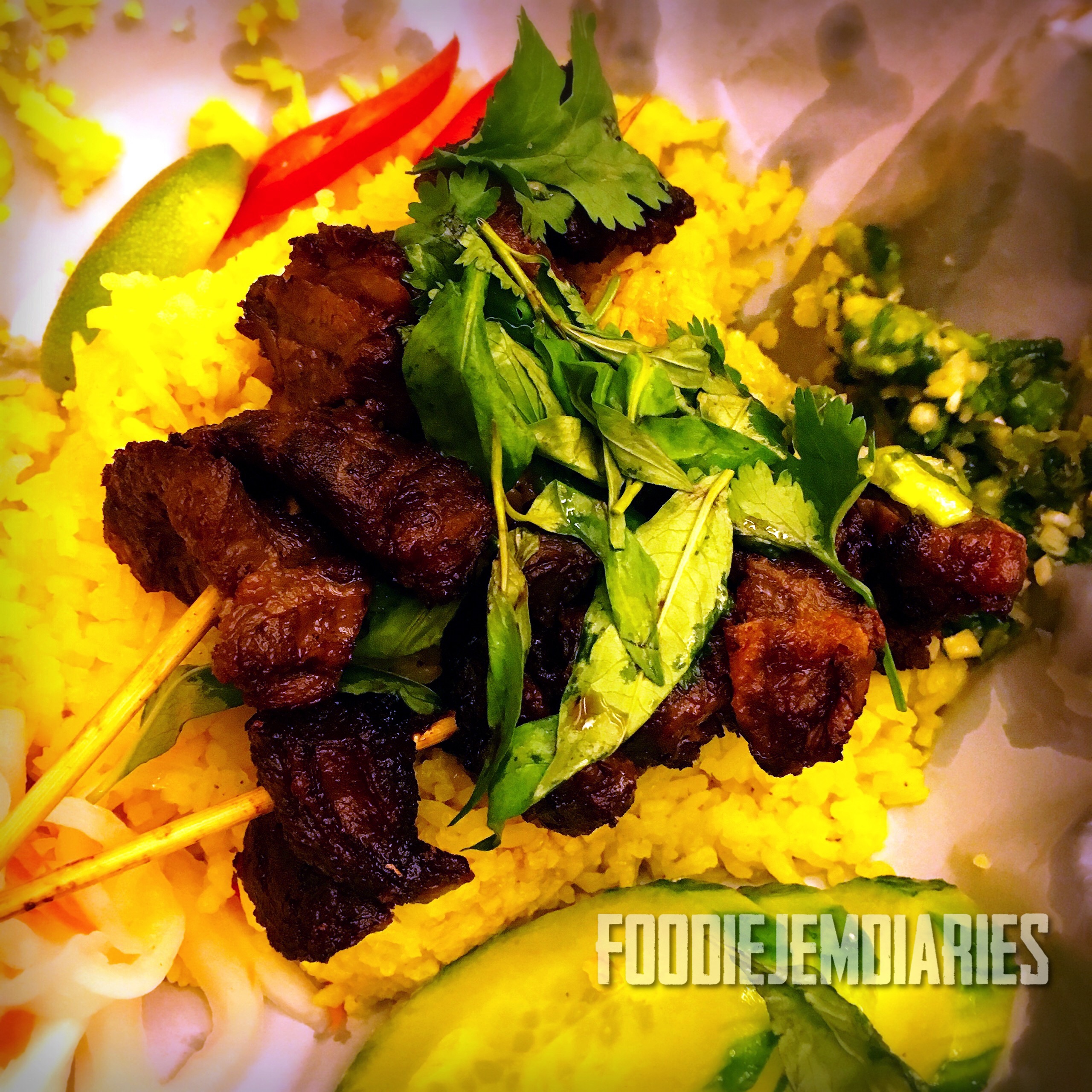 - Satay was very salty but had a good marinade and the beef was tender. The chicken broth steamed rice was soft and had a great aroma and fragrance from the saffron. The pickle added crunch and the ginger onion dressing, fragrance.