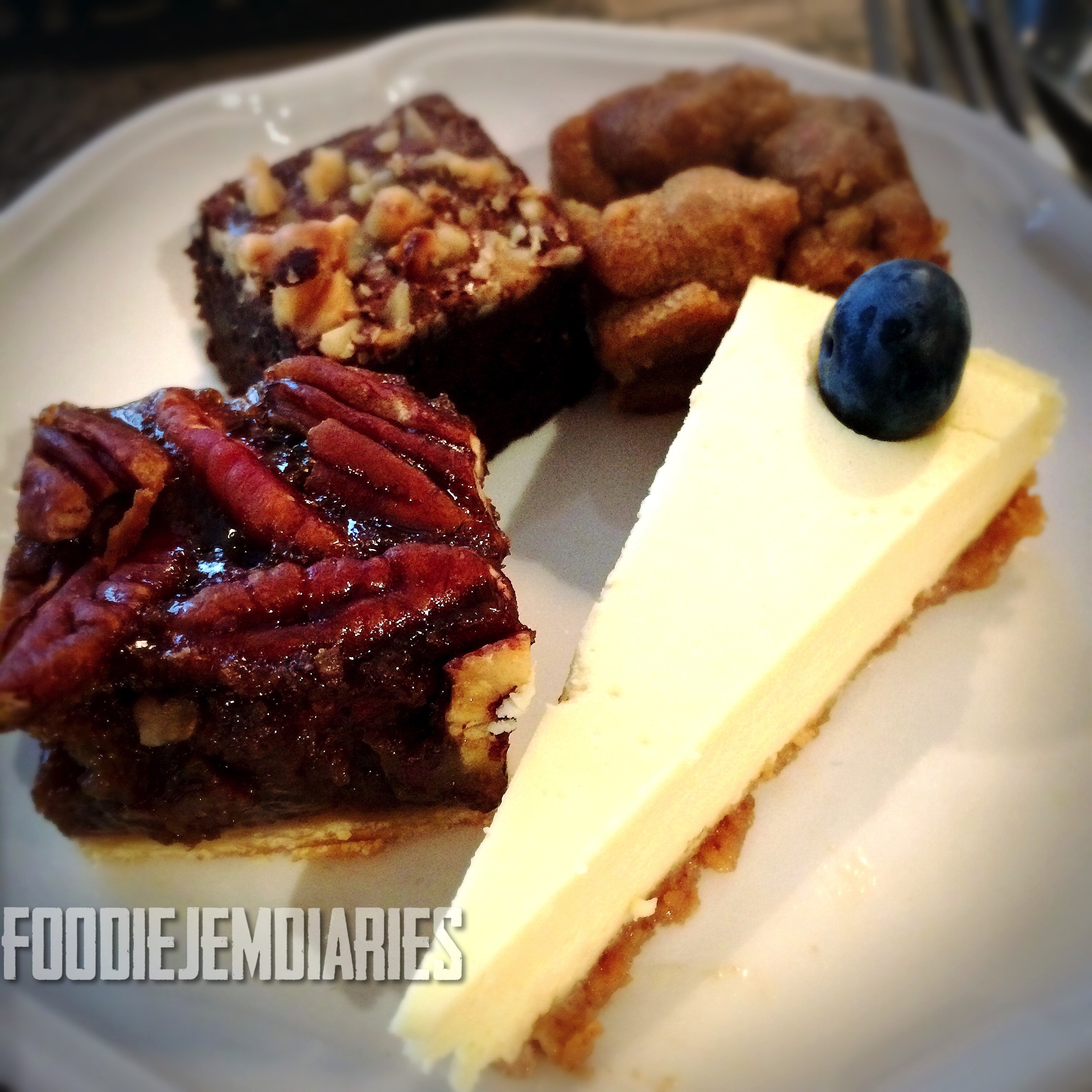 (left)Fruits; (right)Pecan pie, Brownie, Apple pie and Cheese cake.