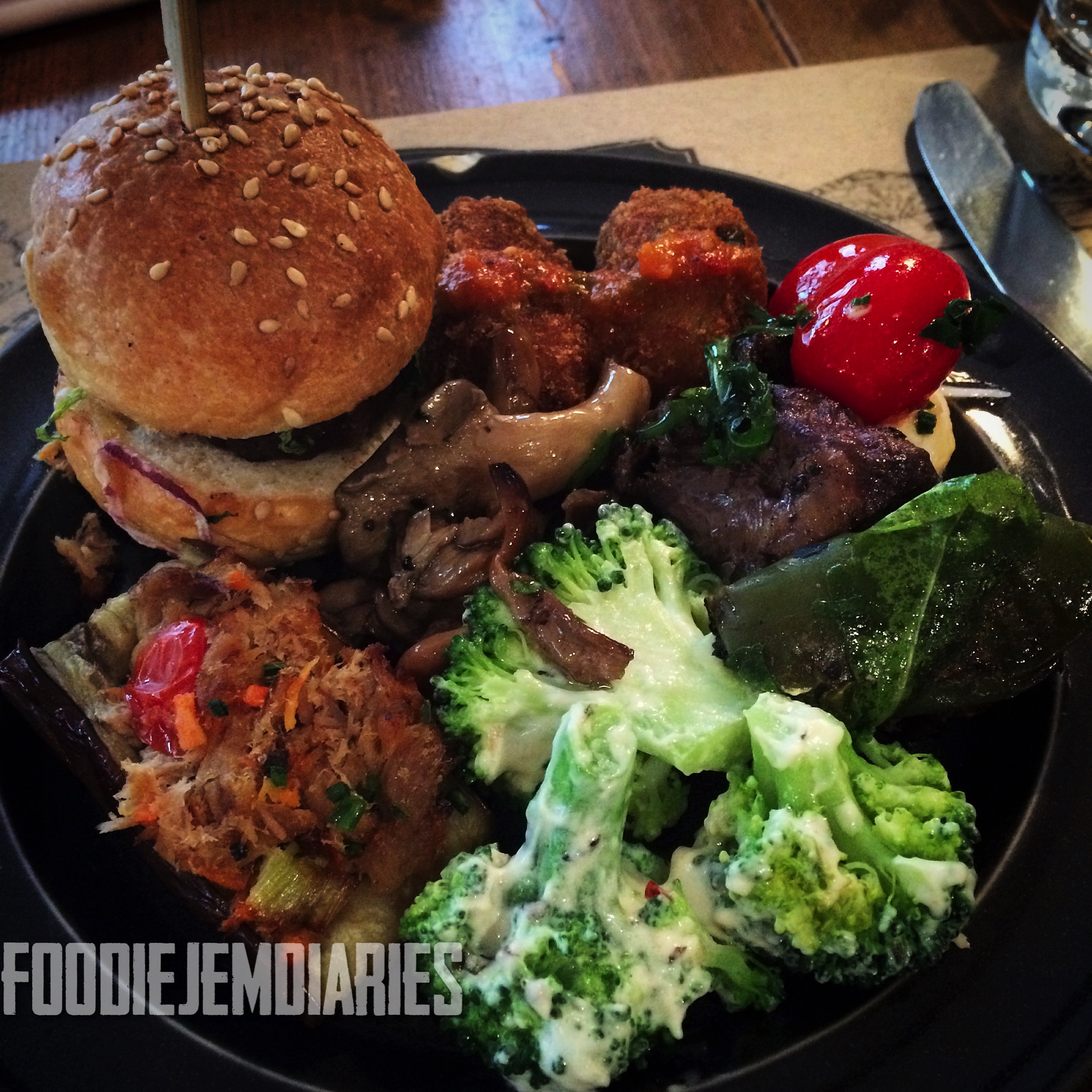 (right) Mini Burger, Potato Croquettes, Roasted Vegetables, Broccoli, Stuffed Eggplant