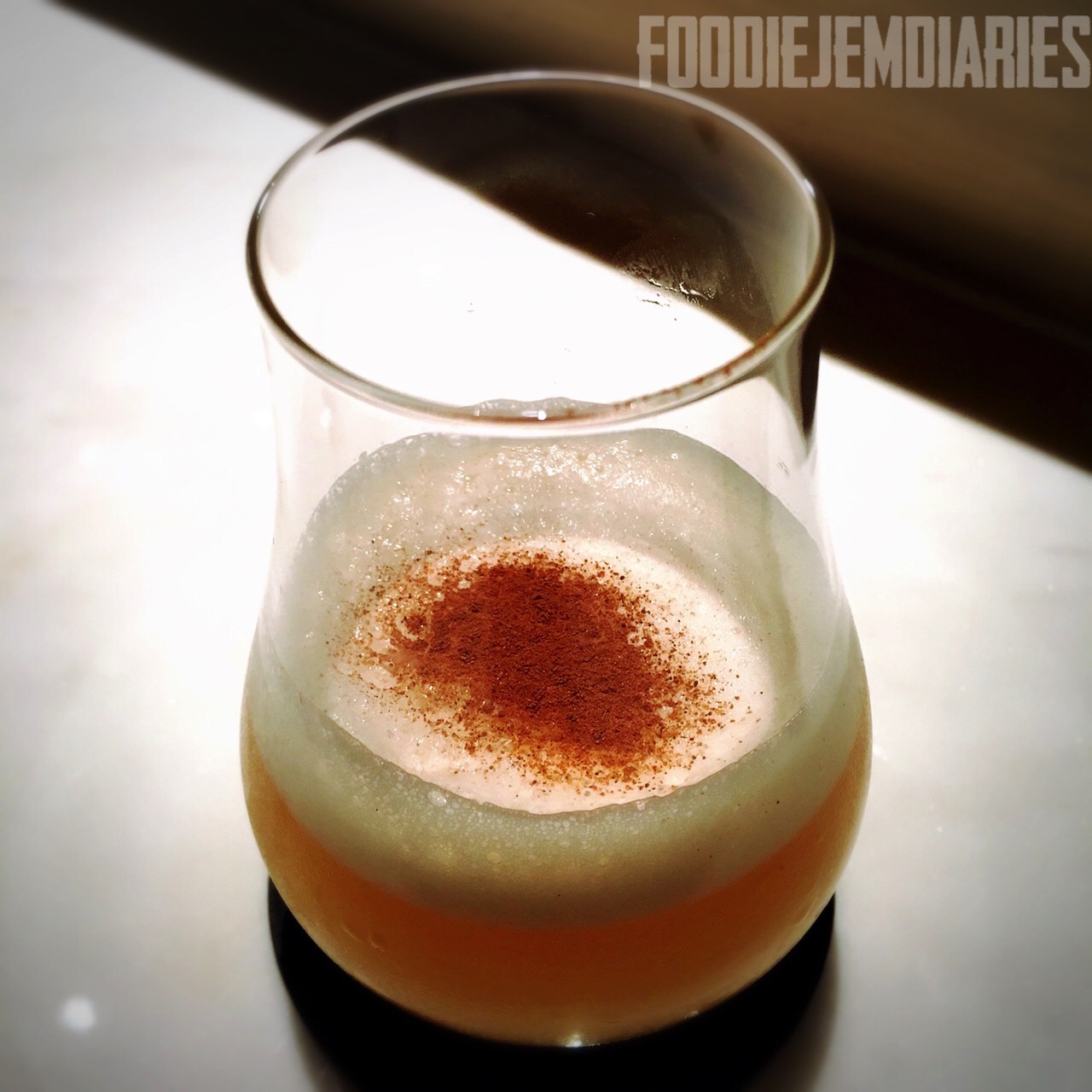- Cinnamon and egg foam adda whimsical element, as well as sweetness to offset the bitterness from the bourbon.