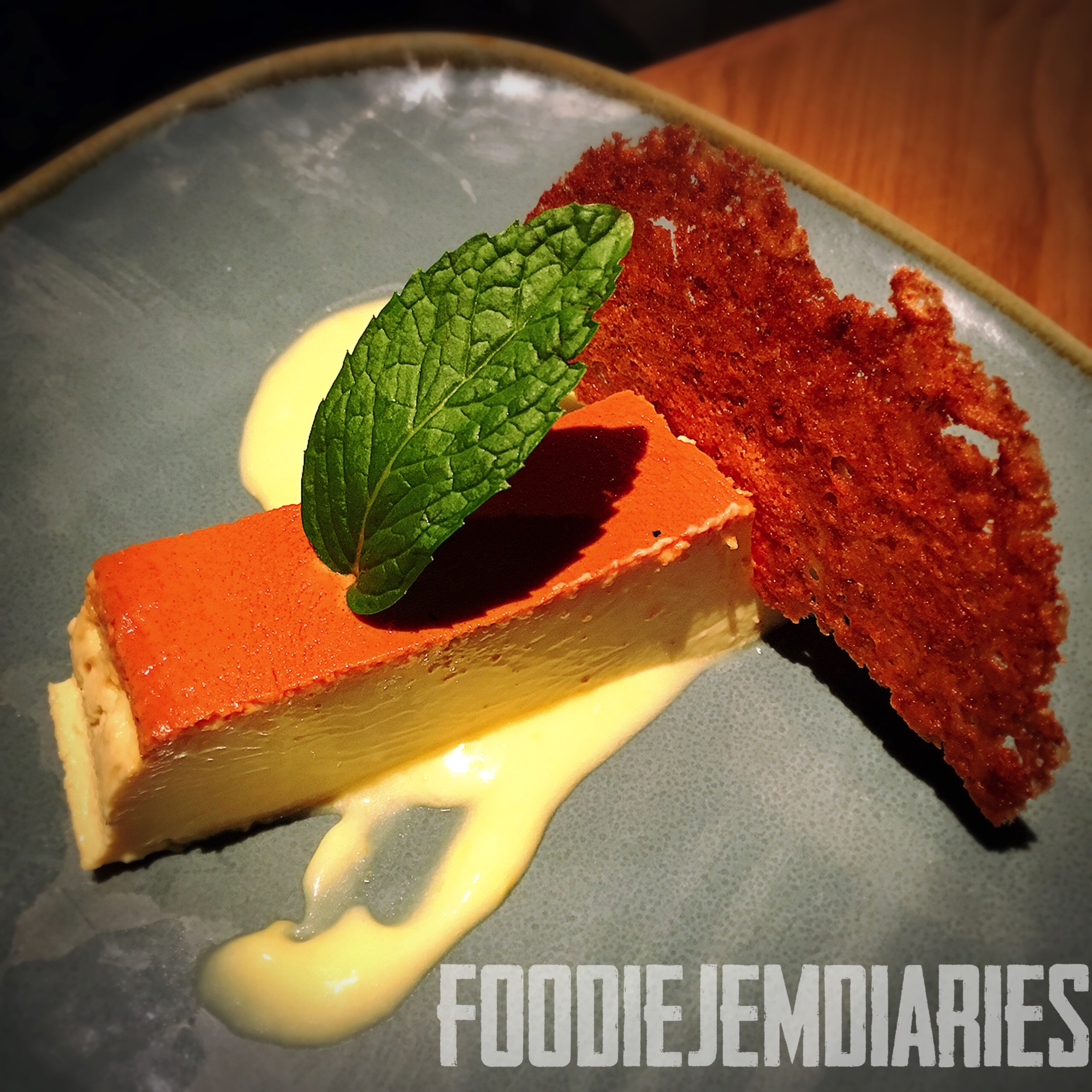 Caramel flan with lemon cream and tuille- A very tasty and rich dessert. Smooth textured not too sweet. Dense and creamy; what a good flan should be!