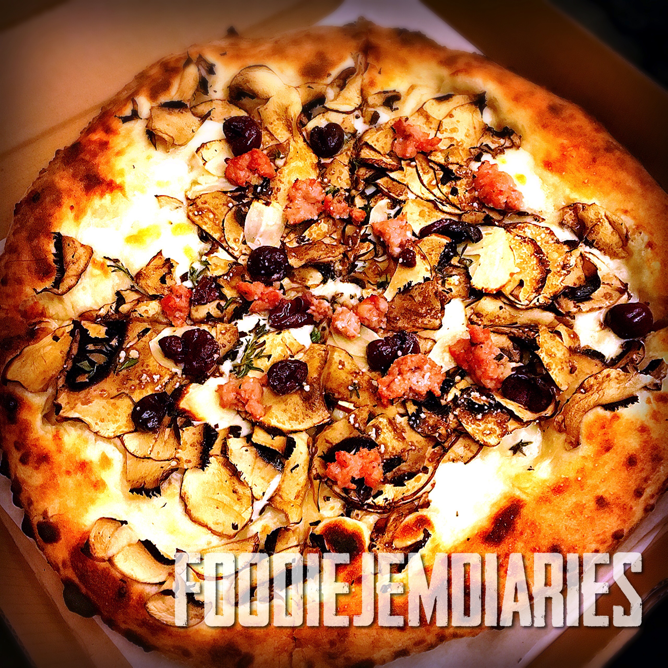 - Fior di latte, sweet sausage, garlic, thyme, pecorino, Gaeta olives & olive oil