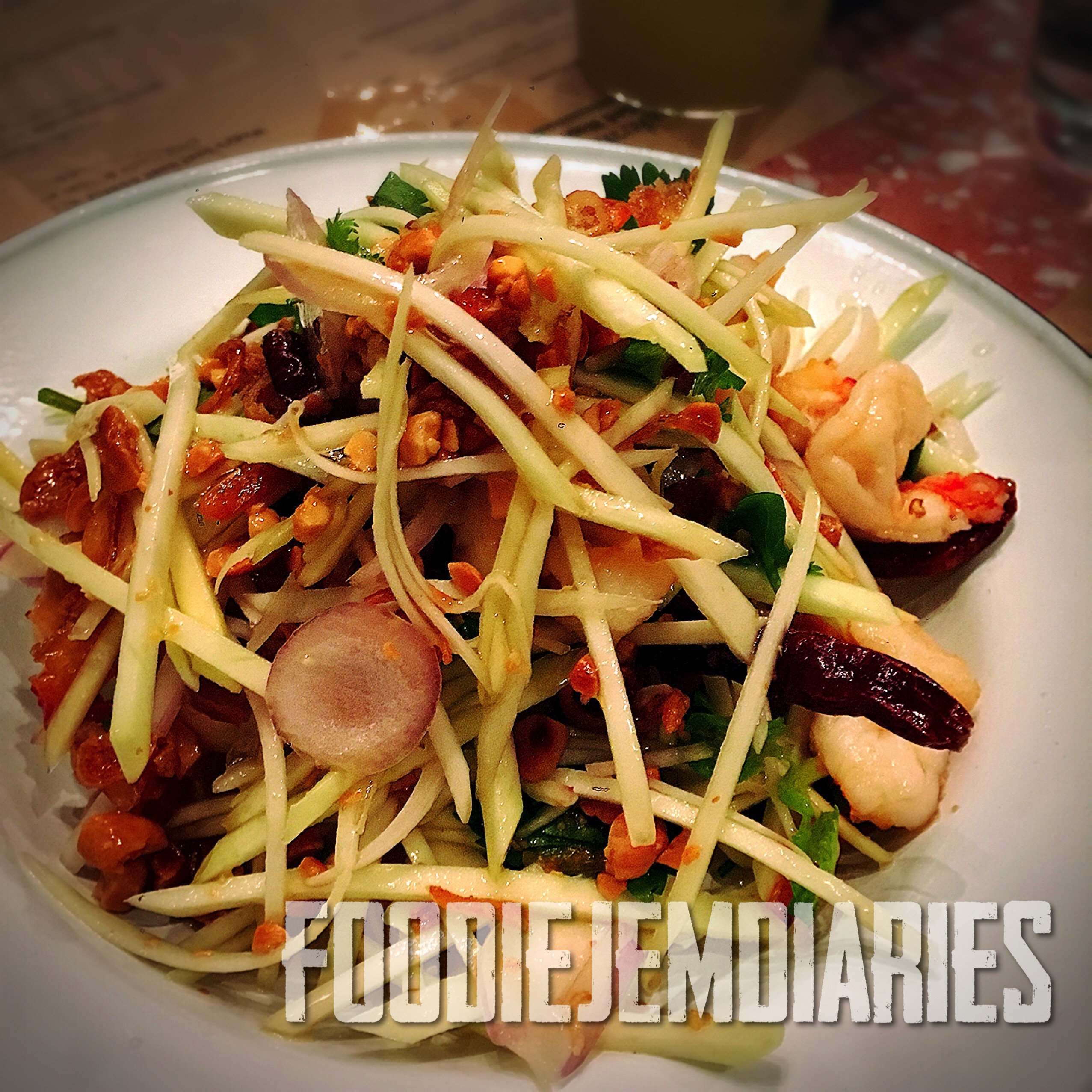 Green Mango Salad with Tiger Prawns, Crispy Shallots, chill & coriander
