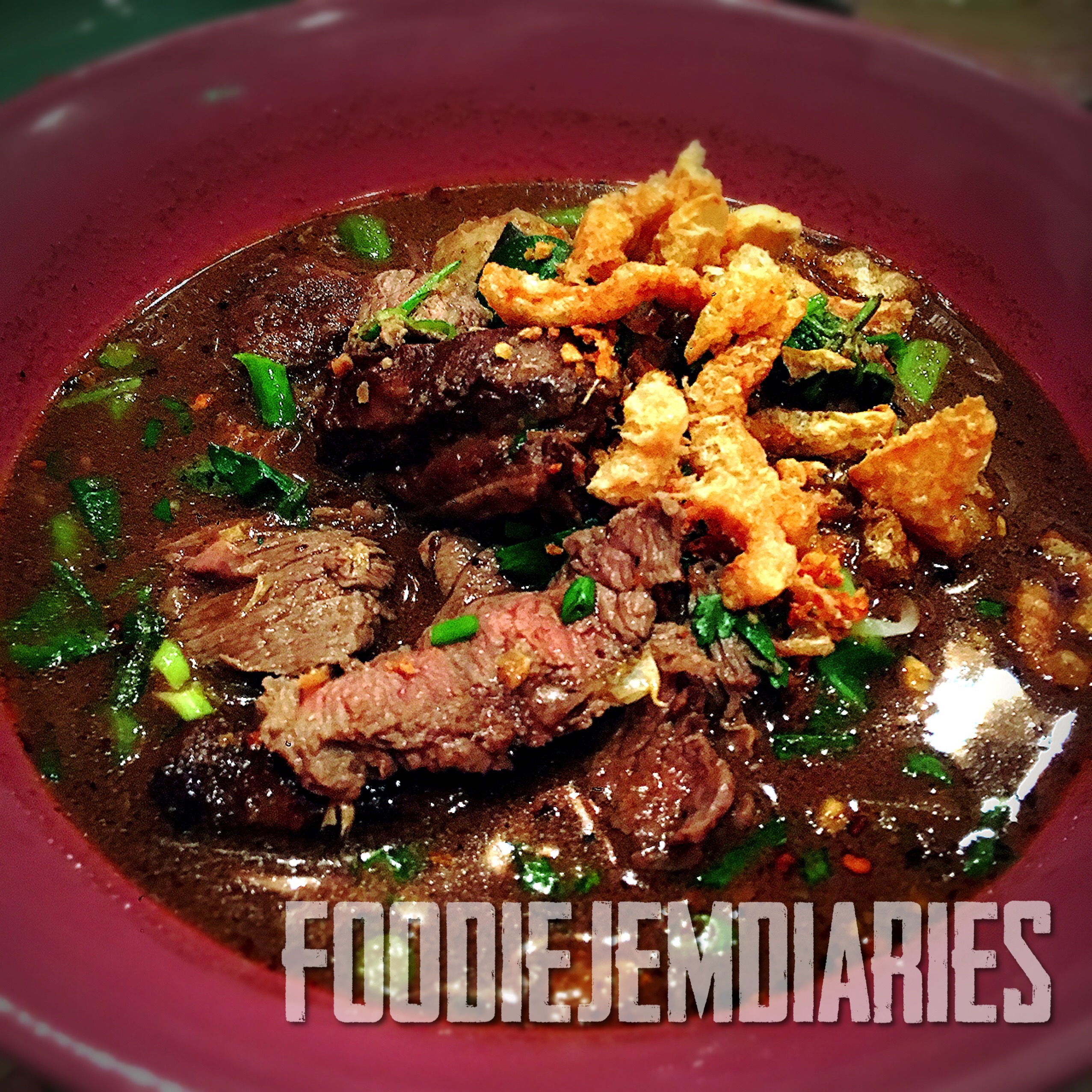 Wagyu Beef Boat Noodle with thin rice noodles, pork rinds & Thai watercress