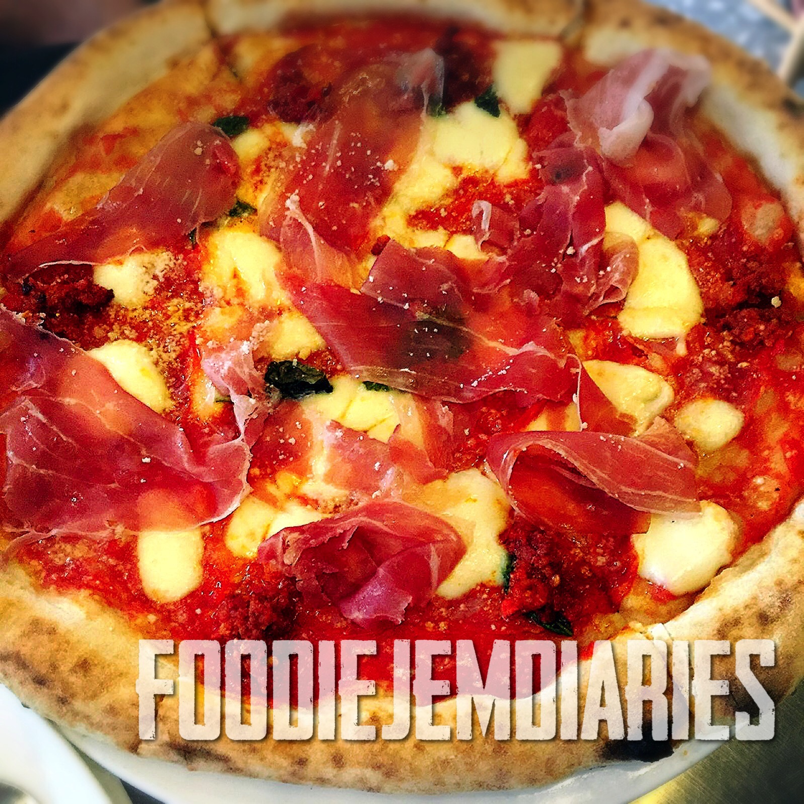 - Parma Ham laid liberally on top of a bed of soft and gooey Mozzarella, slightly spicy tomato sauce and a thick Pizza base.