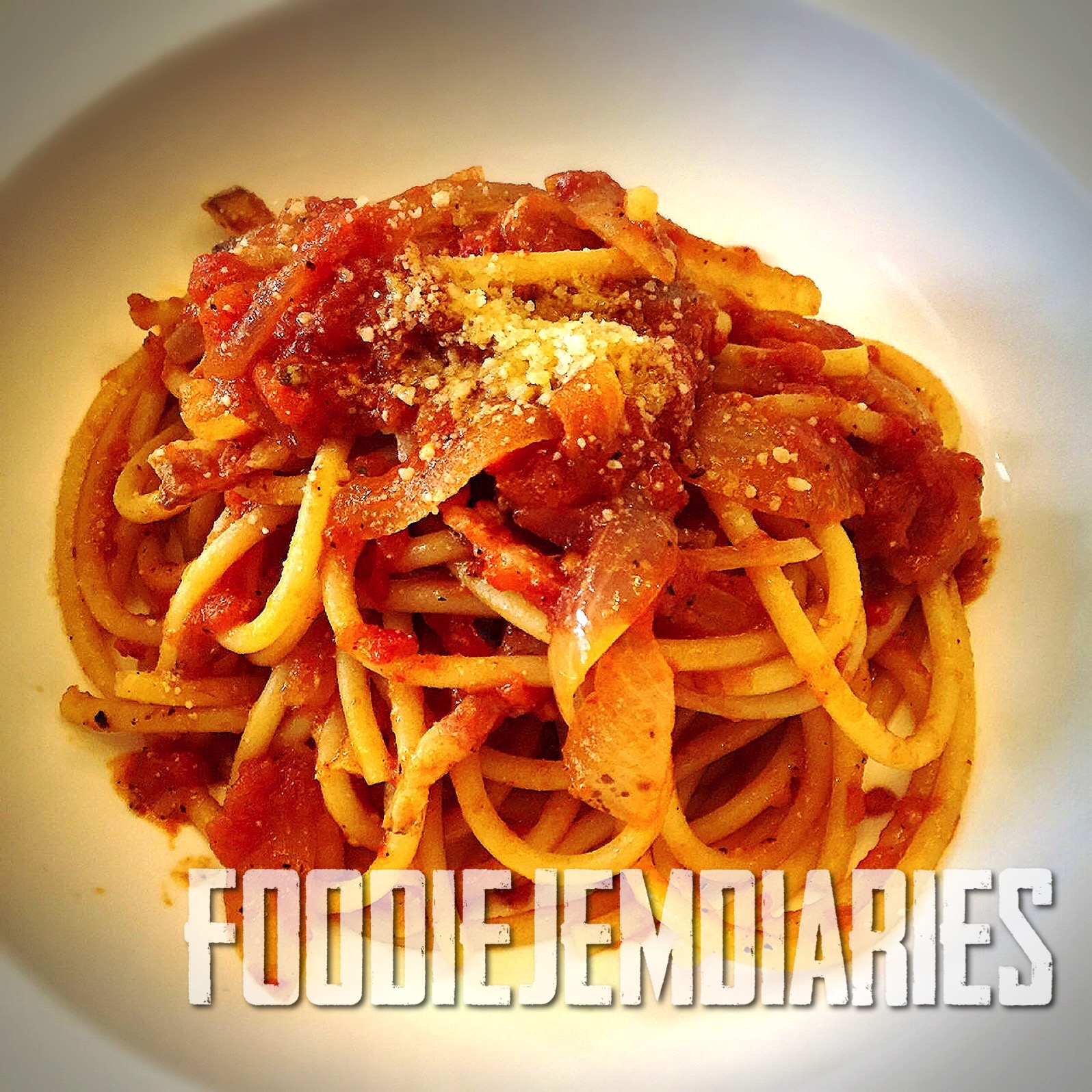 - Slightly spicy and similar to the Arrabbiata sauce, coating thicker Spaghetti and slithers of pork cheeks.
