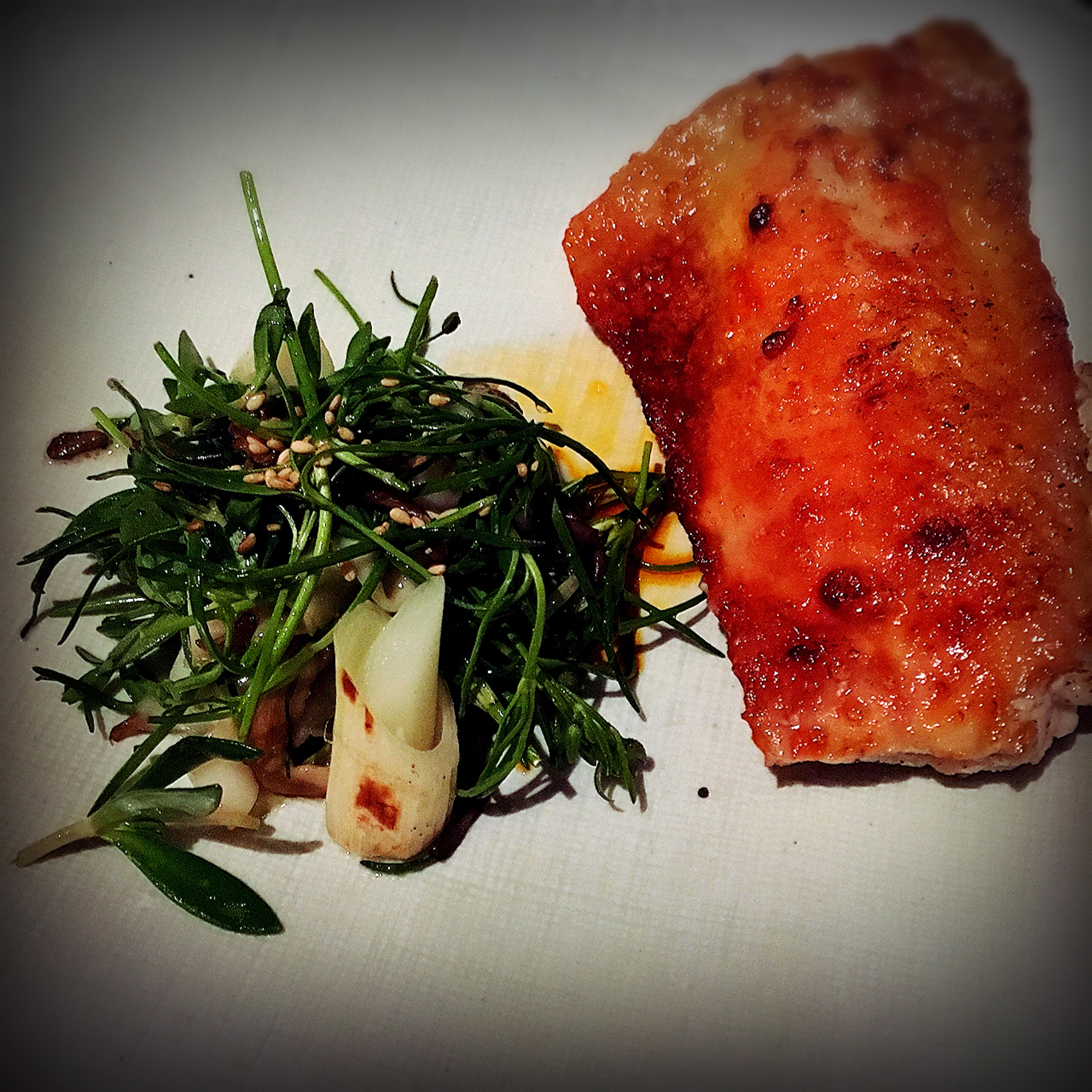 - Namul leaves with dressed in korean chilli oil and crispy Snapper.