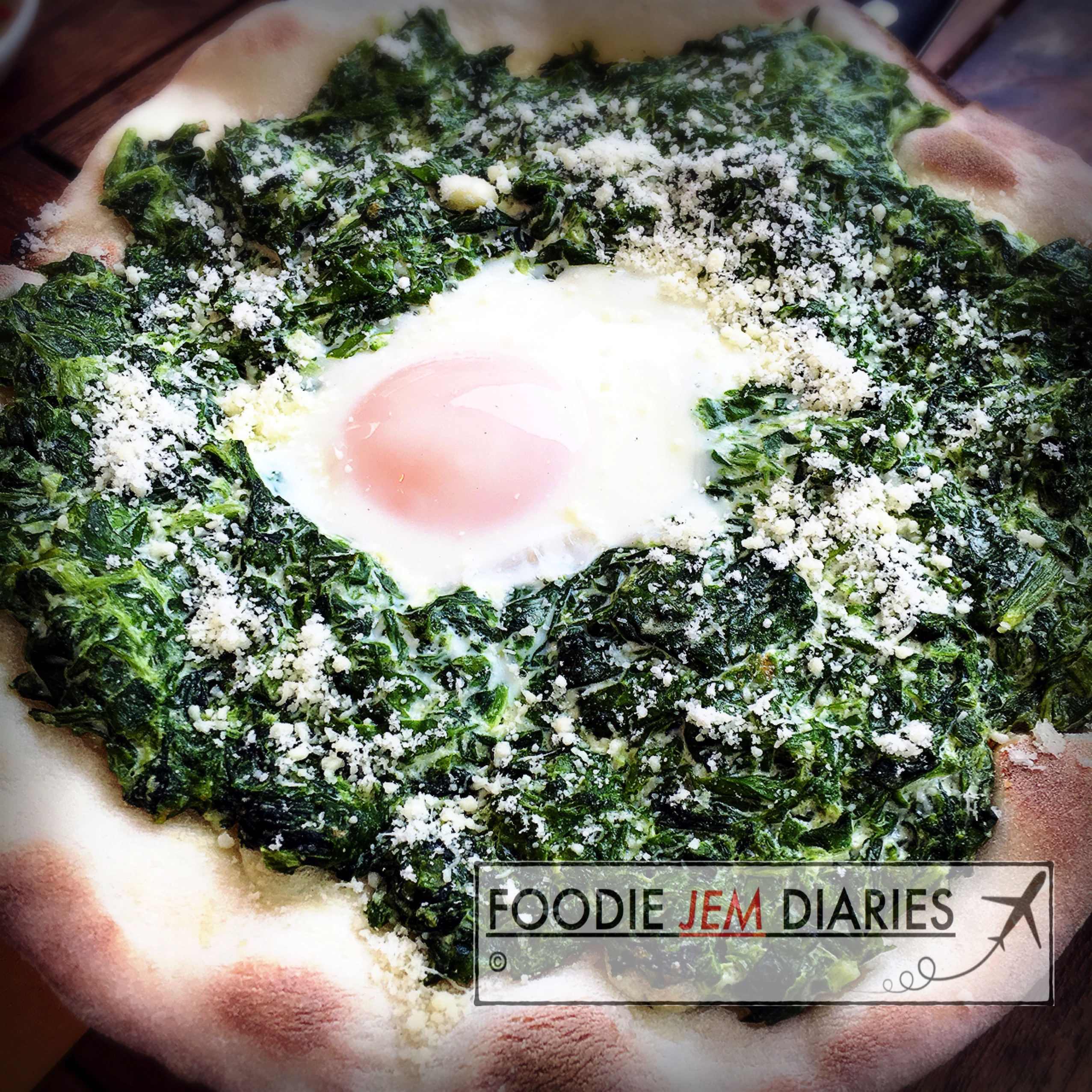 - Creamy spinach and parmesan topping, with that semi-cooked egg to sauce the whole pizza, NOM! Just goes you that homely and fuzzy feeling when you eat it!