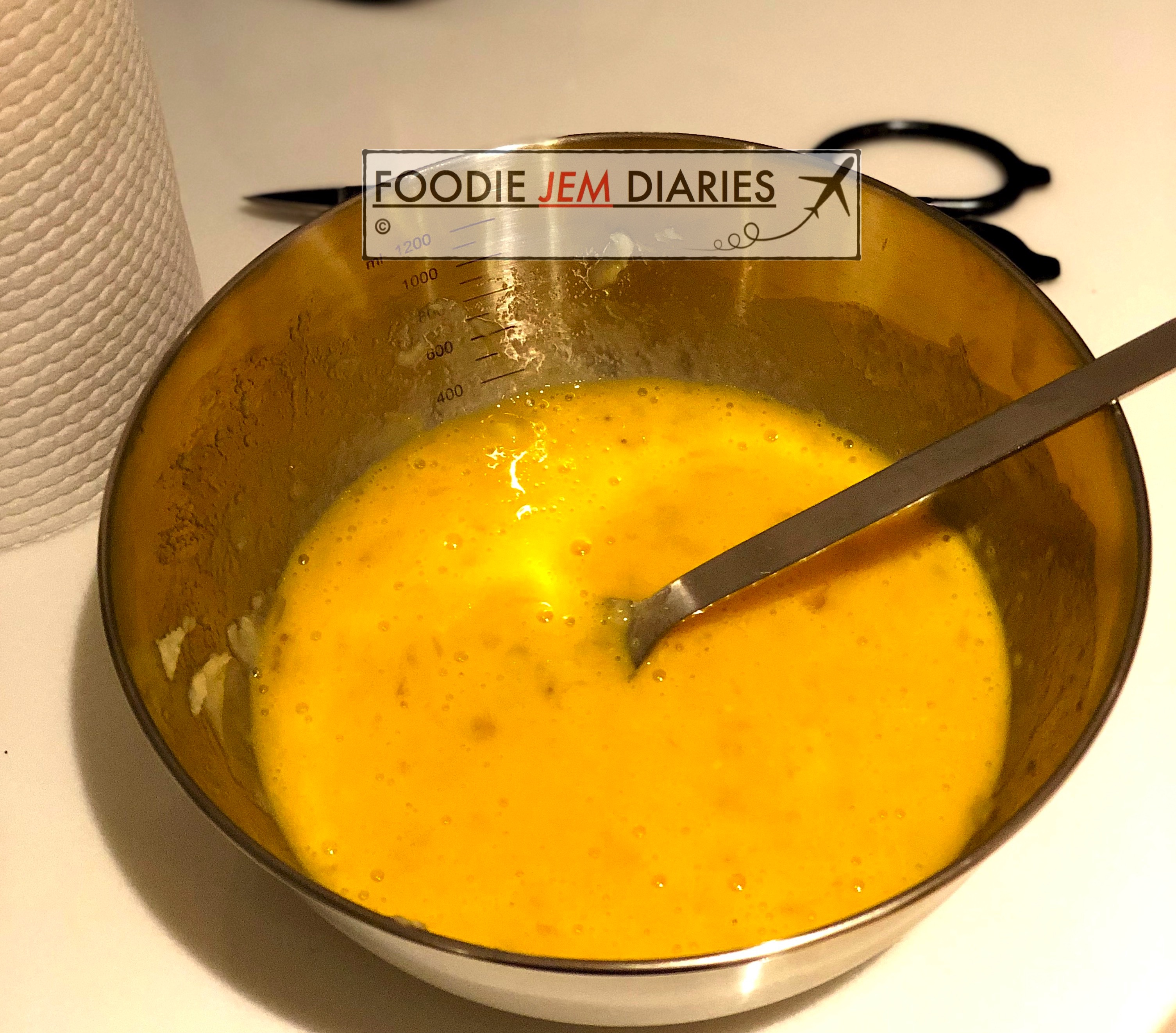 - Crack in the 2 eggs into the purée and whisk until well combined.
